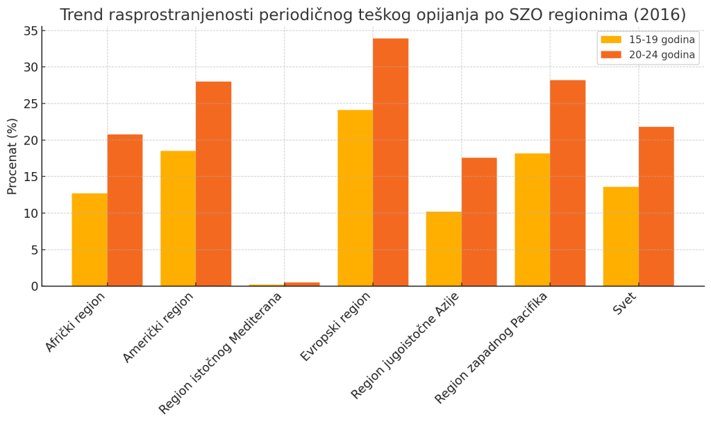 Globalni trendovi: Preko 40 % populacije od 15 do 24 godine konzumira alkohol, dok je procenat periodičnog teškog opijanja kod adolescenata (15–19) u evropskom regionu 24,1 %, a kod mladih odraslih (20–24) čak 33,9 %.